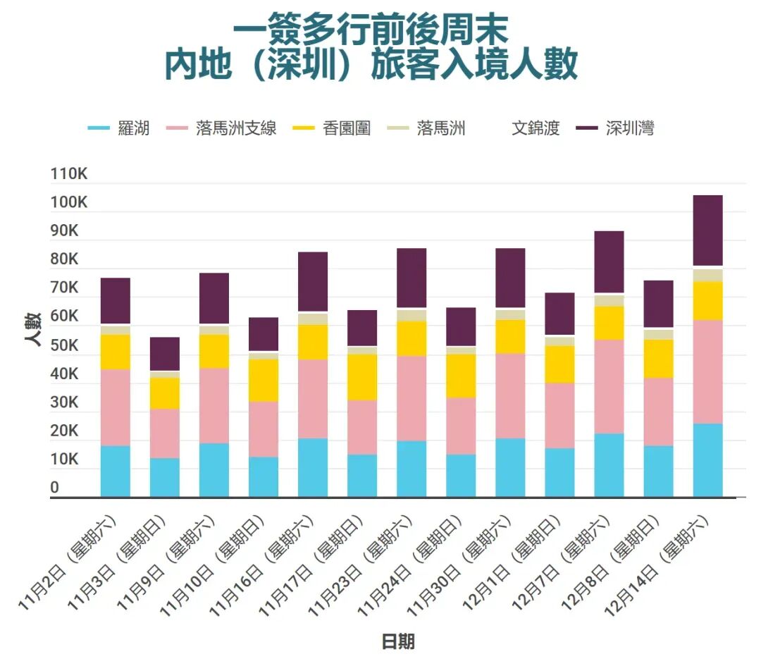 首先看看具体数据,12月14日是政策恢复后的第二个周六,内地访港旅客人数达到16.1万,创下近几个月来的单日新高,其中有超过10.5万名内地游客通过与深圳连接的六个陆路口岸入境香港!