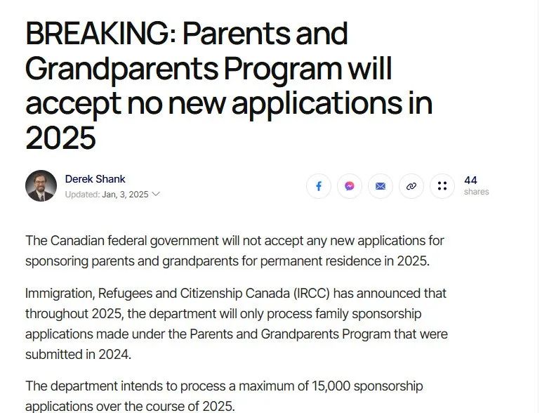 据CIC 消息,加拿大联邦政府2025年将不再接受任何新的父母和祖父母团聚移民的申请。