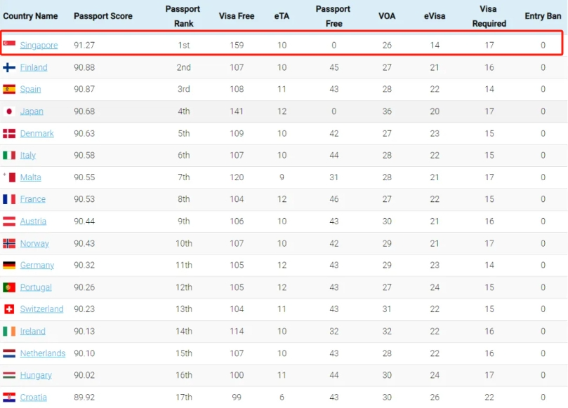 截至今年1月,新加坡护照的综合得分为91.27,持有人可免签进入159个国家和地区,芬兰护照以可免签进入107个国家/地区的优势排名第二,而西班牙则以108个免签国位列第三。