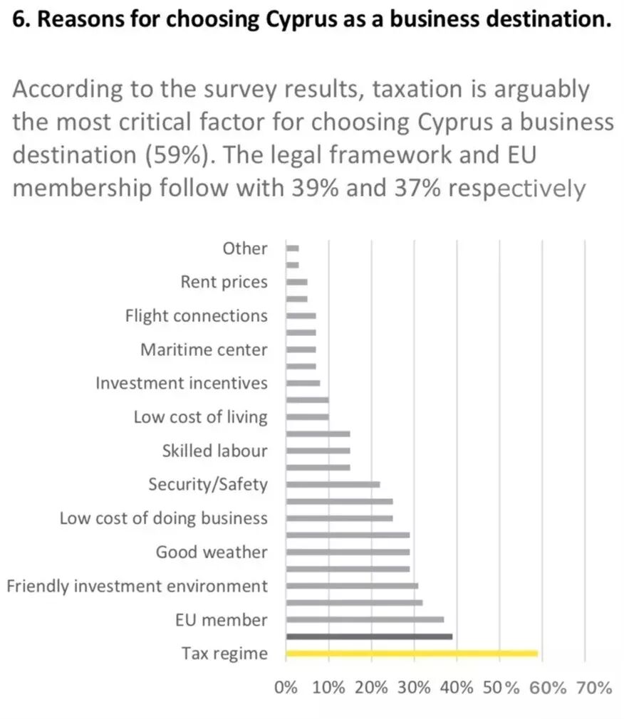 相比之下,塞浦路斯的税率明显要低很多,因此一些高净值人士将身份从高税制国家转变为低税制国家也就不足为奇了。安永报告还指出,塞浦路斯受投资者青睐,主要是因为其税收体系、法律架构以及欧盟成员身份。此外,塞浦路斯友好的投资环境、宜人的天气以及经商低成本,也是几大吸引点。数据源:安永报告