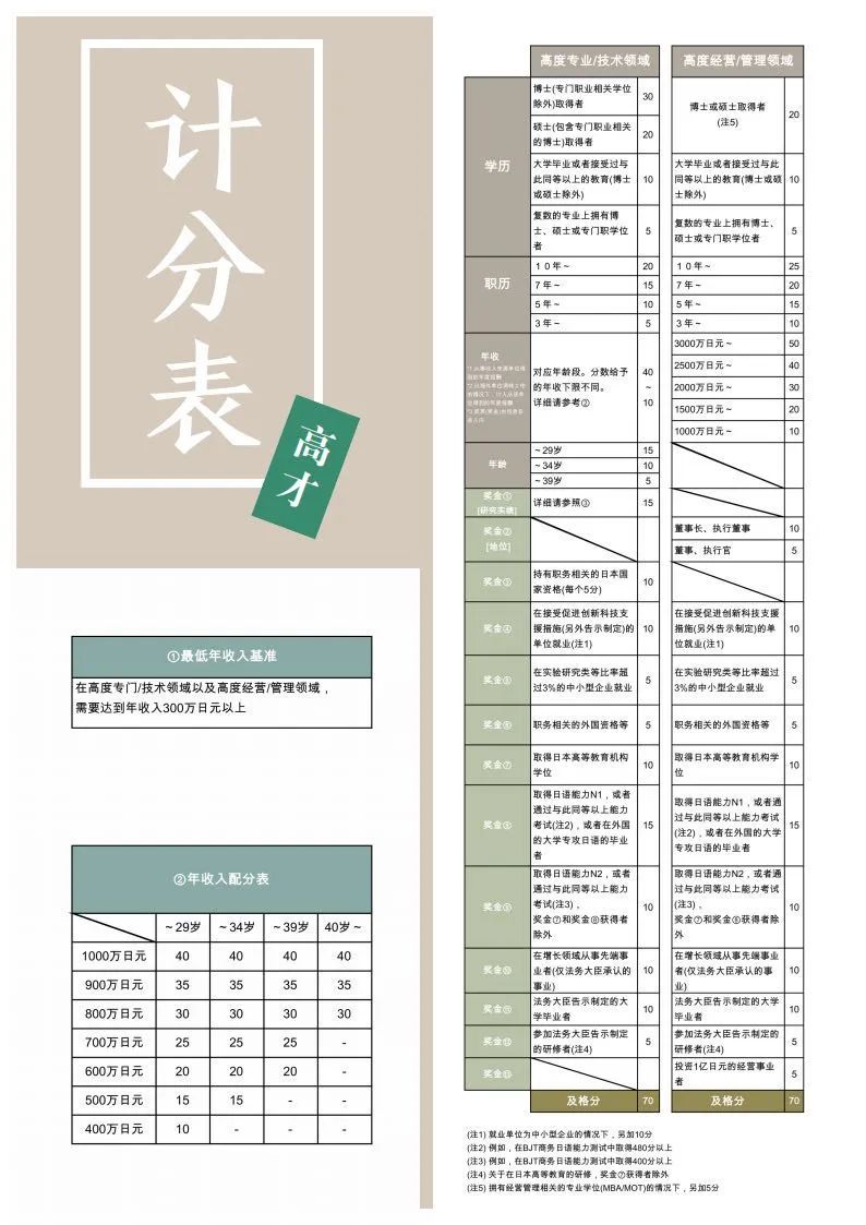 日本政府为了促进国内经济发展,吸引外国高级人才,在2012年开始导入【高度专门职】签证,采用积分制的方式。针对申请人的“教育、就业经历、年收入”等事项进行评分,达到70分以上便可申请高级人才签证高级人才签证,并优先处理入境日本事宜。