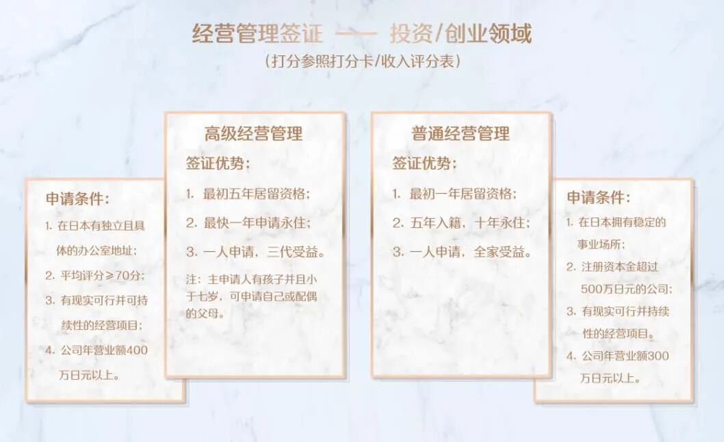 高级人才签证通过积分制来评定申请标准,分别根据申请人的年龄、工作年限、年收入、学历等指标进行评分。日本法务省规定,通过高度人才打分表,评分在70分以上,就可认定为高度人才,申请永住所需的在日居住年数就缩短为3年;而评定在80分以上,可以一年转永住。