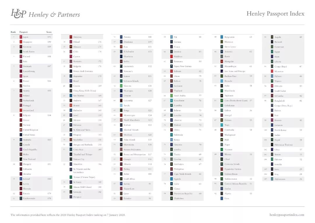 2020年亨利护照指数(Henley Passport Index)于英国当地时间1月7日发布,日本连续第三年占“头把交椅“,另两个亚洲国家新加坡、韩国紧随其后。