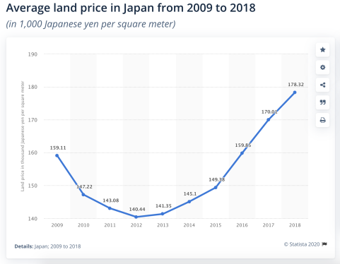 在历次黑天鹅事件中的亮眼表现,让日元资产成为海外投资者的避险首选。其中,日本不动产更是受到追捧,根据statista数据显示,日本全国平均地价在2012-2018上涨超过26%。