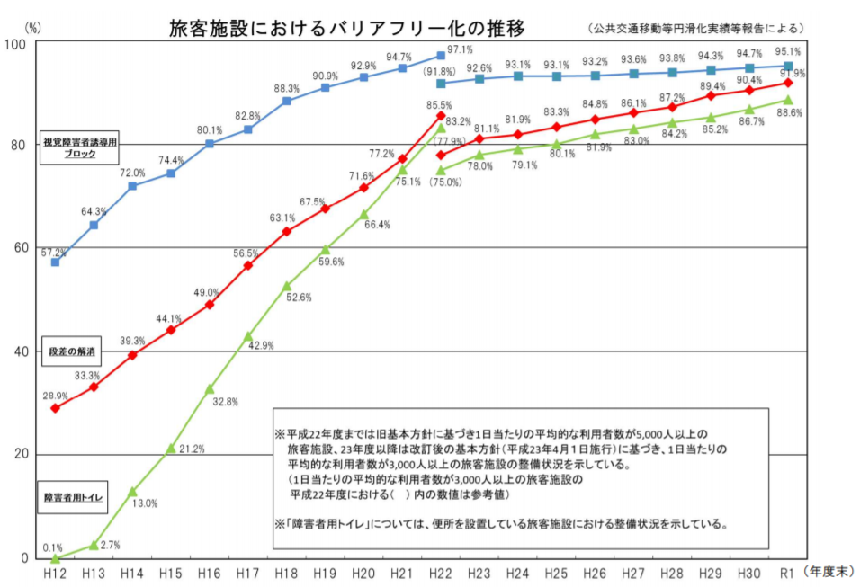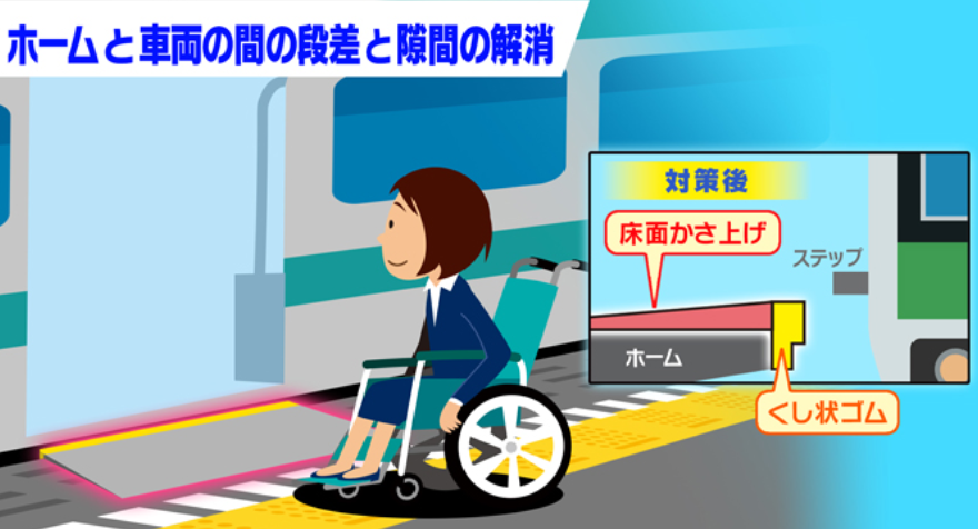 截至2018年,全日本平均每天有3000人次以上乘降的电车站中,已经有89.3%的车站实现了“至少有一条完整无障碍的通路”。