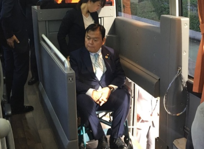这是日本国土交通大臣试乘了“有电梯功能的公交车”,轮椅使用者无需帮助,一按电梯就上车了。这种高级巴士速度很快,将用于连接两个主要机场和东京市。