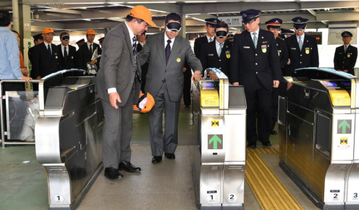 这是著名铁路公司“西武铁道”的领导们在以盲人身份尝试搭乘电车,以切身感受来观察是否有可优化之处。