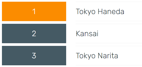 第一名是东京羽田机场,第二名是大阪关西机场,第三名是东京成田机场,第九名是福冈机场。