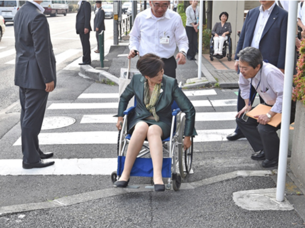 这是东京都知事小池在视察街道的无障碍情况,细心的人可以发现,东京街头很多地方都会把台阶抹掉,给轮椅留出方便上下的通道。