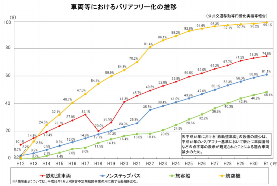 截至2019年,日本99.1%的飞机、74.6%的电车地铁、61.1%的公交车、48.4%的客轮都已经实现无障碍化。