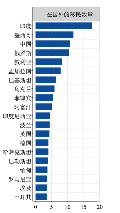 印度仍然是世界上国际移民来源输出最大的国家,人数多达1750万。其次是墨西哥,有1200万。中国大陆以约1100万的输出成为世界第三大移民输出国。