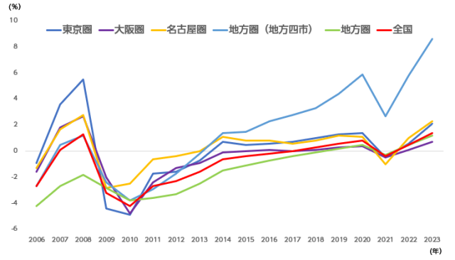 2、都市圈和地方圈东京、大阪、名古屋三大都市圈的全用途平均地价上升2.1%,住宅用地+1.7%,商业用地+2.9%,都市圈的住宅区和商业区的价格高涨,反映出人口重新出现回归都市中心的趋势。