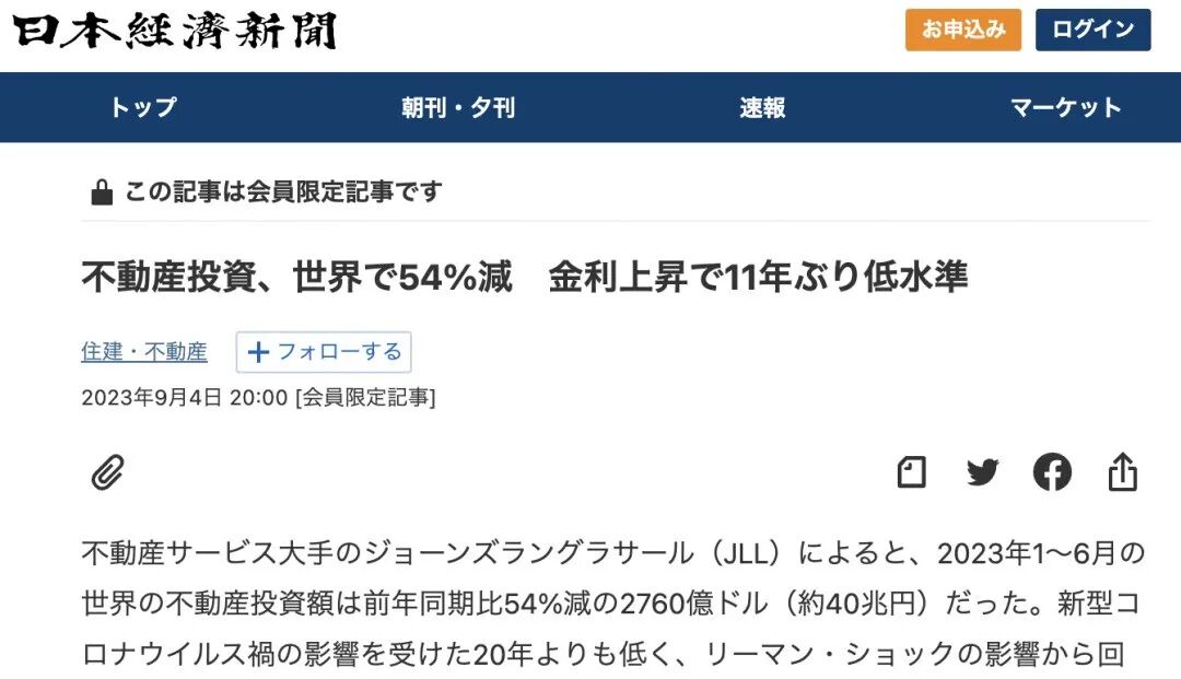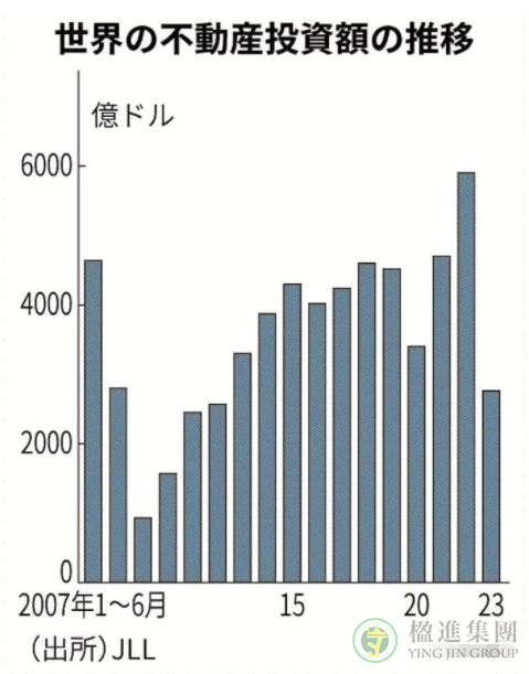 据日媒报道,房地产服务大企业仲量联行(JLL)近期发表的数据显示,2023年1~6月全球房地产投资额同比下降54%,降至2,760亿美元。