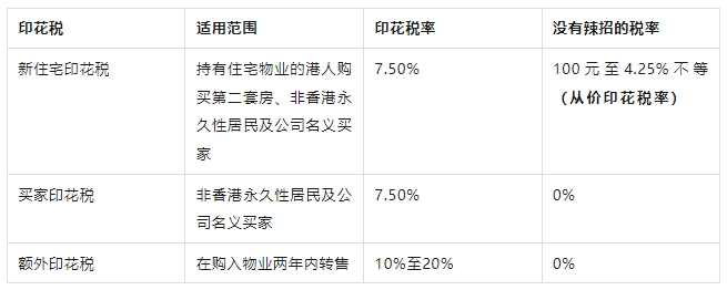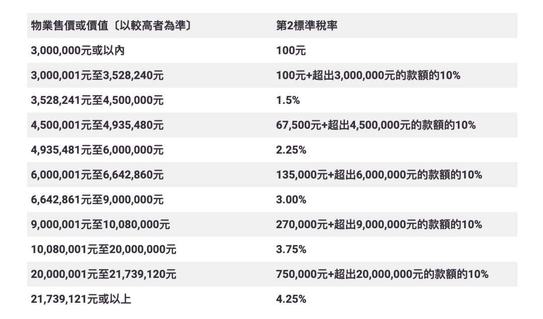 现在,无论是海外买家、公司买家,又或是想购置第二套房的买家,都和香港本地首置买家一样,只需要缴交从价印花税。下列为目前最新的从价印花税标准,根据物业的售价或价值,从100元到4.25%不等: