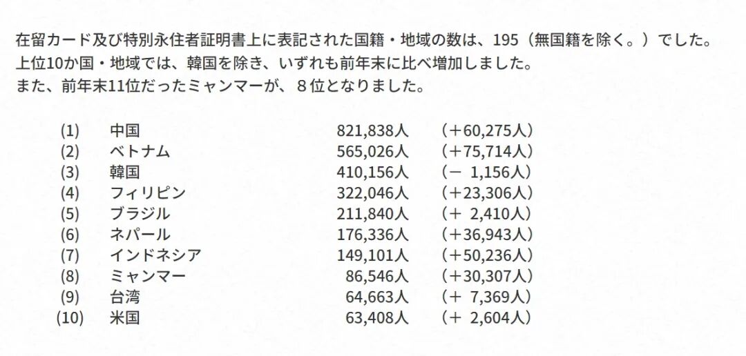 其中日本约有82.2万名中国居民,比2022年增加了6万人,是近年来最大的一次增幅,人数稳居日本第一。