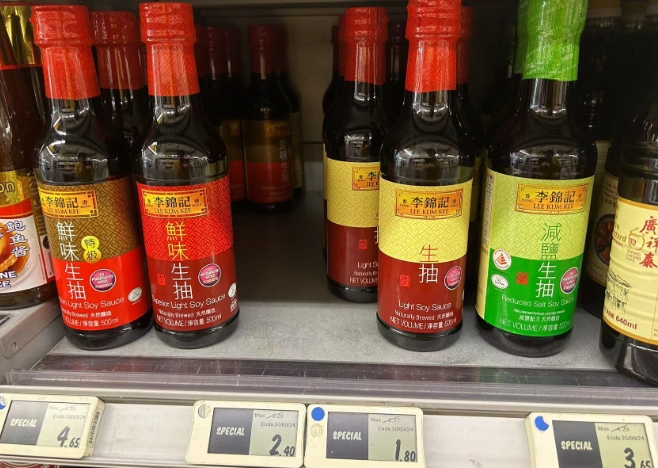 酱油:李锦记普通生抽塑料瓶装9.9元(1.8新币),减盐生抽玻璃瓶装20元(3.65新币)等。