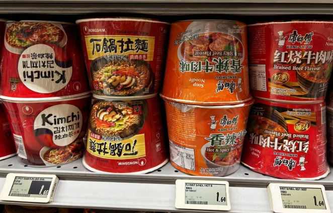 方便面:康师傅香辣牛肉面/红烧牛肉面一桶售价9元(1.64新币),农心石锅拉面特价后也是相同价格。