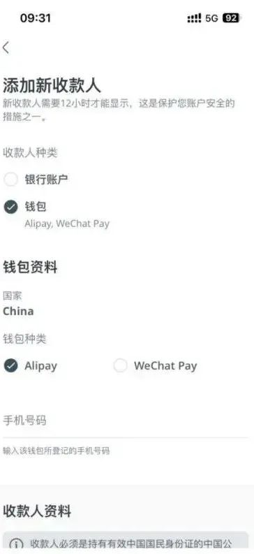 然后,进入【添加新收款人】页面,选择【钱包】作为转账方式,并选择中国和相应的支付平台(支付宝或微信支付)即可完成设置。
