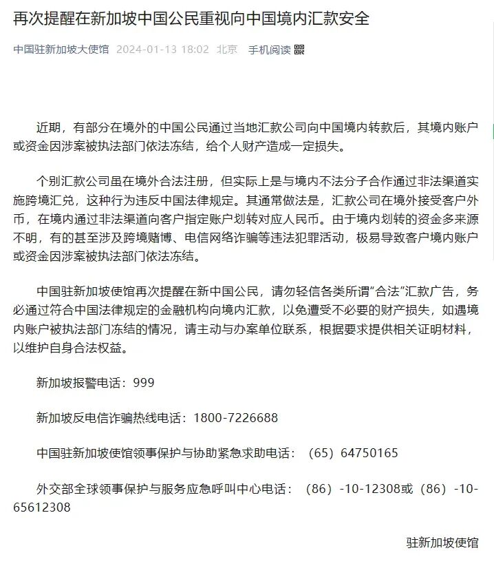 此外,中国驻新加坡大使馆也曾多次发文提醒大家要使用正规渠道汇款,以确保资金的安全和合法性。