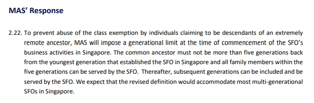 新加坡金管局在官方网站上发布的回应文件中明确指出,符合豁免条件的单一家办不受特定结构限制,可以通过信托、基金会或其他合法结构持有资产,但资金必须完全来源于家族成员。为了避免豁免许可被滥用,新加坡金管局还特别规定,从设立单一家办的第一代算起,往前追溯的家族成员不得超过五代。