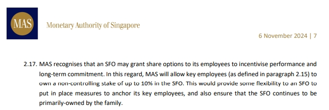 同时,新加坡金管局还允许非家族成员的关键职员持有单一家办最多10%的股权,这些关键职员包括执行董事、首席执行官、首席财务官等投资专业人士。